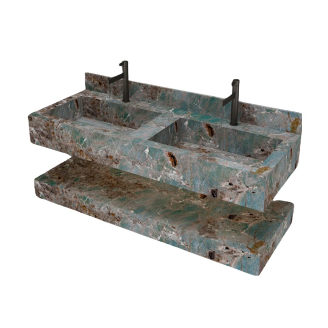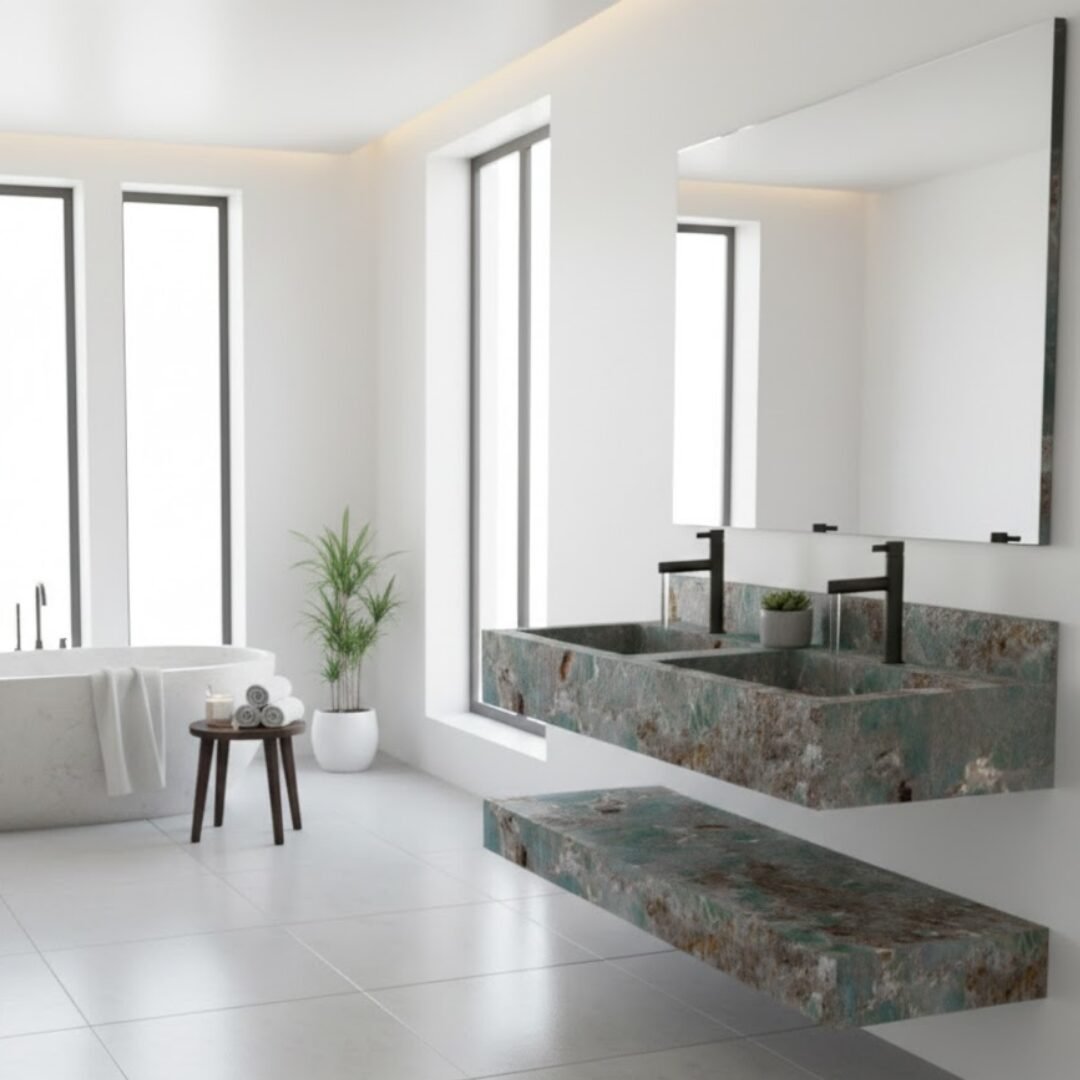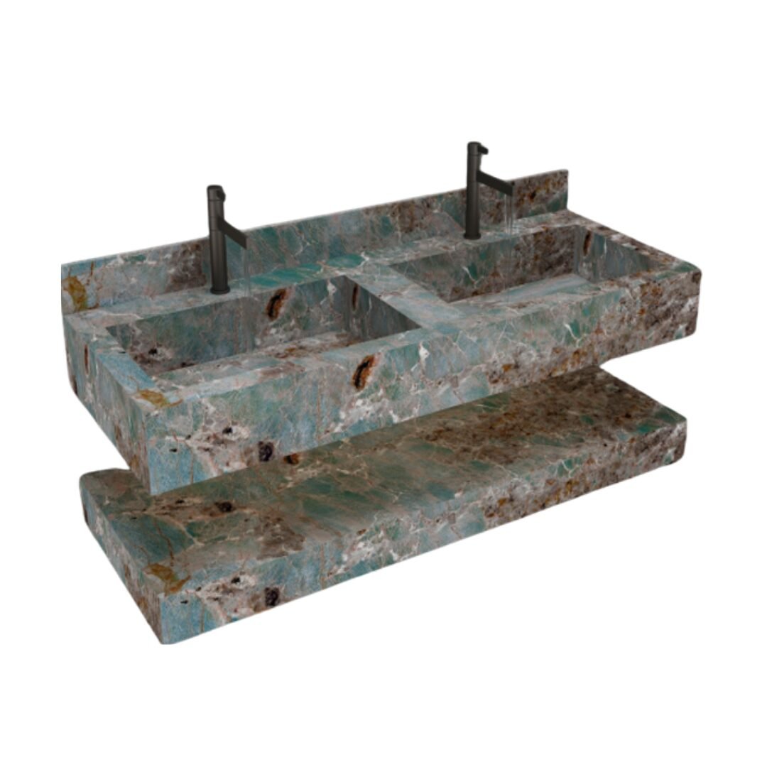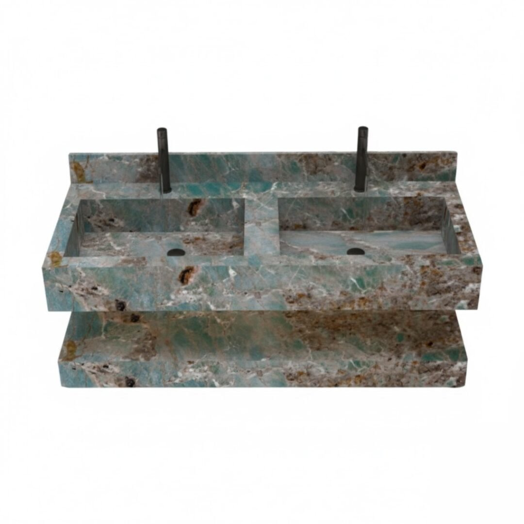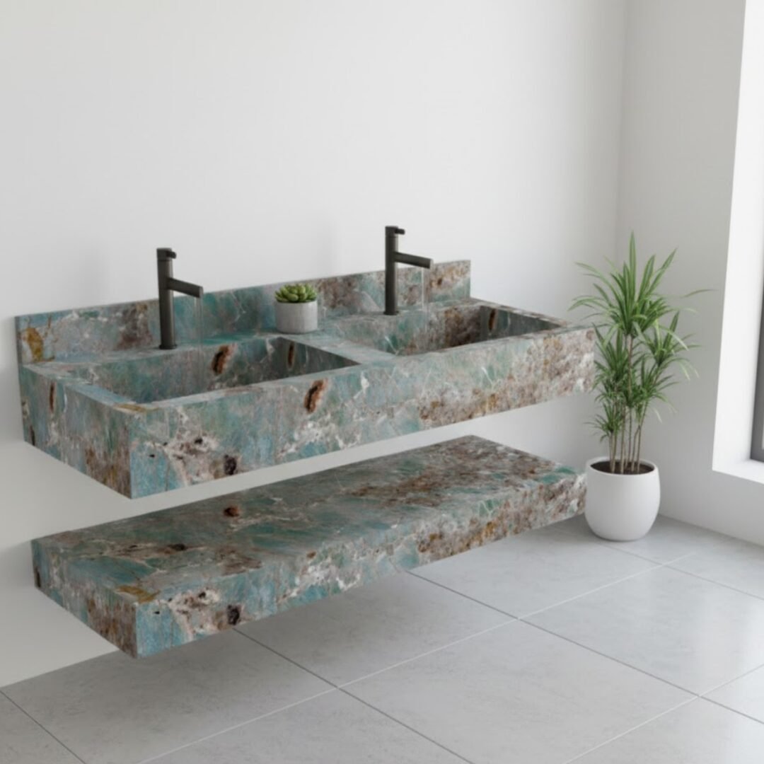 AMAZONITE AQUA: Elevate your bathroom aesthetic with this luxurious floating sink. Crafted from premium stone with rich teal and earthy brown tones, this vanity features a seamless rectangular basin and sleek, minimalist lines. The integrated backsplash and matte black faucet add a touch of modern elegance, while the matching lower shelf provides functional storage. Paired with an oval LED-lit mirror, this setup blends contemporary design with natural beauty, perfect for high-end interiors seeking a bold statement piece.