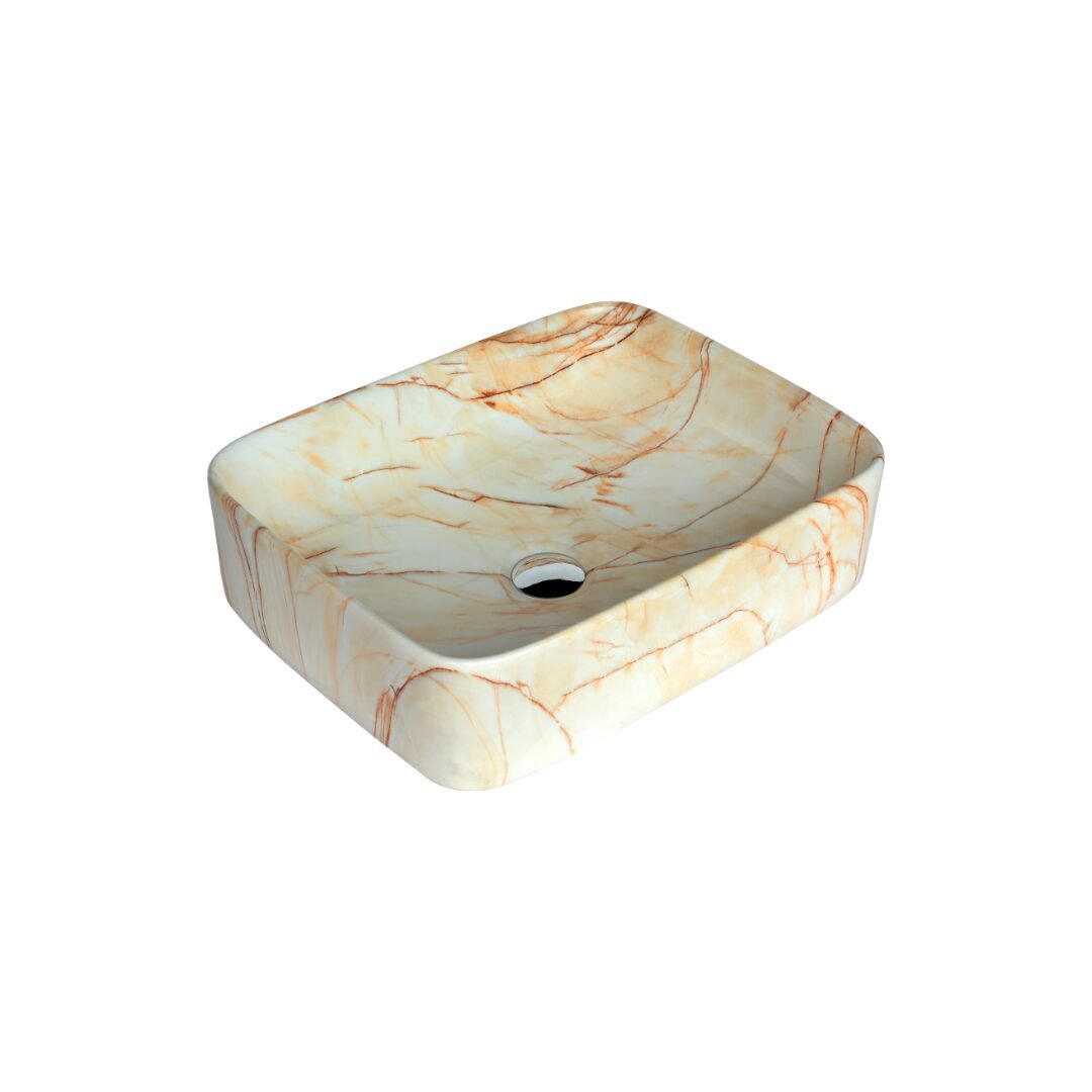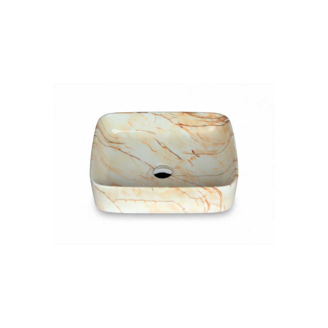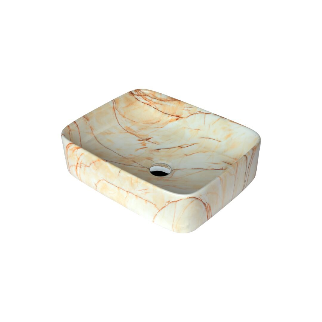This is a stylish and modern rectangular ceramic wash basin, perfect for enhancing the aesthetic appeal of any bathroom. The basin features a pristine white base adorned with an elegant gold marble vein pattern, giving it a luxurious and contemporary look. Its glossy finish adds a touch of sophistication while making the surface easy to clean and maintain. The gently curved edges provide a sleek and smooth appearance, ensuring it blends seamlessly with various bathroom styles. The basin is designed for countertop installation, making it ideal for vanity setups in both residential and commercial spaces. It includes a central drain hole, compatible with standard drain fittings, ensuring efficient water drainage. Its compact yet practical design provides ample space for everyday use while maintaining a minimalist profile. This wash basin is an excellent choice for those seeking to combine functionality with high-end design.