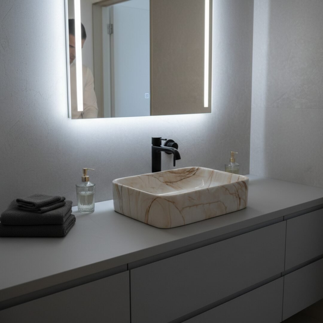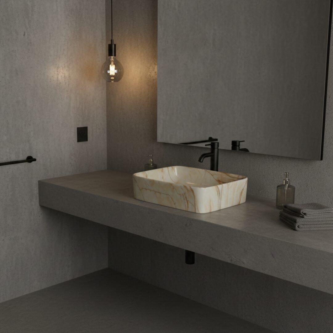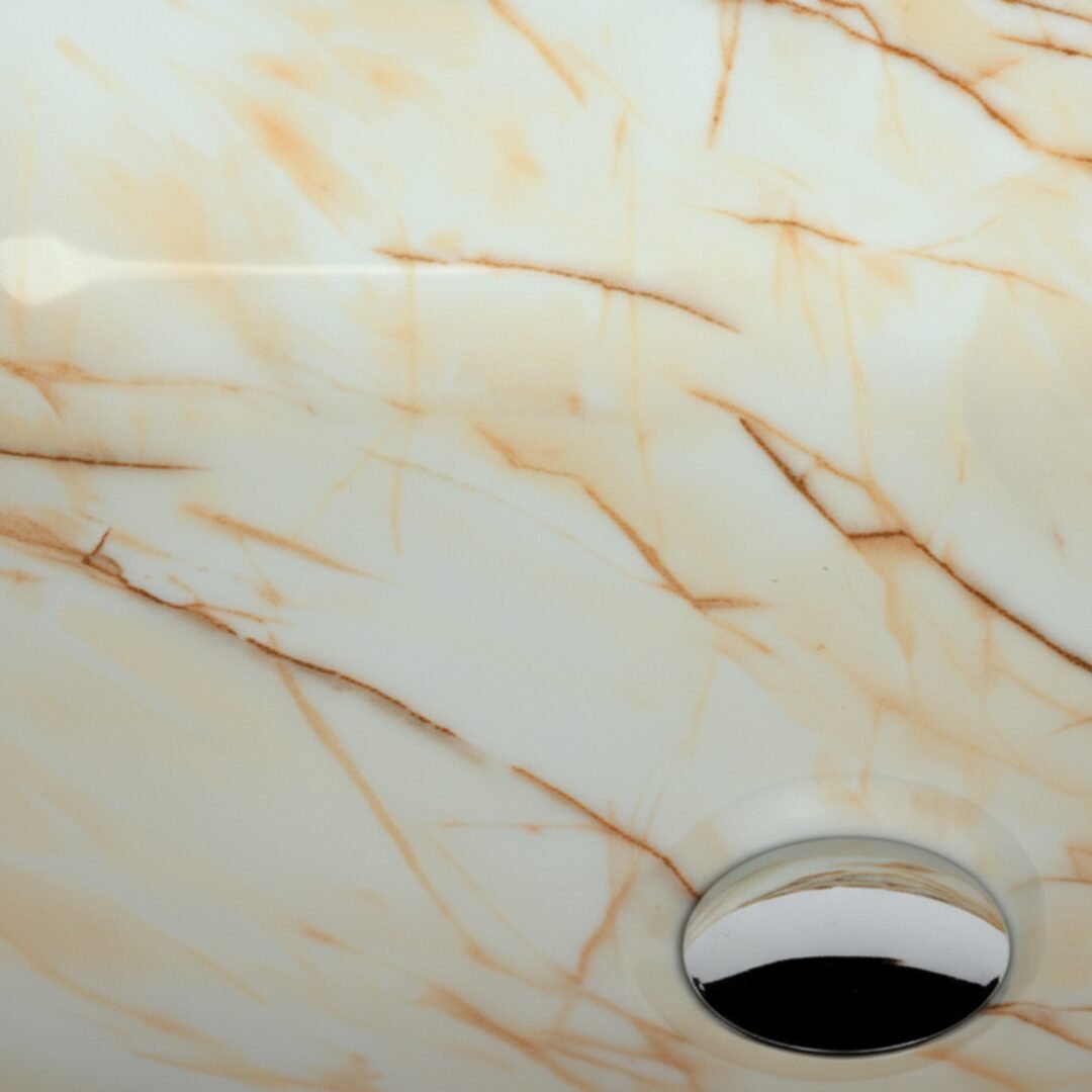 This is a stylish and modern rectangular ceramic wash basin, perfect for enhancing the aesthetic appeal of any bathroom. The basin features a pristine white base adorned with an elegant gold marble vein pattern, giving it a luxurious and contemporary look. Its glossy finish adds a touch of sophistication while making the surface easy to clean and maintain. The gently curved edges provide a sleek and smooth appearance, ensuring it blends seamlessly with various bathroom styles. The basin is designed for countertop installation, making it ideal for vanity setups in both residential and commercial spaces. It includes a central drain hole, compatible with standard drain fittings, ensuring efficient water drainage. Its compact yet practical design provides ample space for everyday use while maintaining a minimalist profile. This wash basin is an excellent choice for those seeking to combine functionality with high-end design.