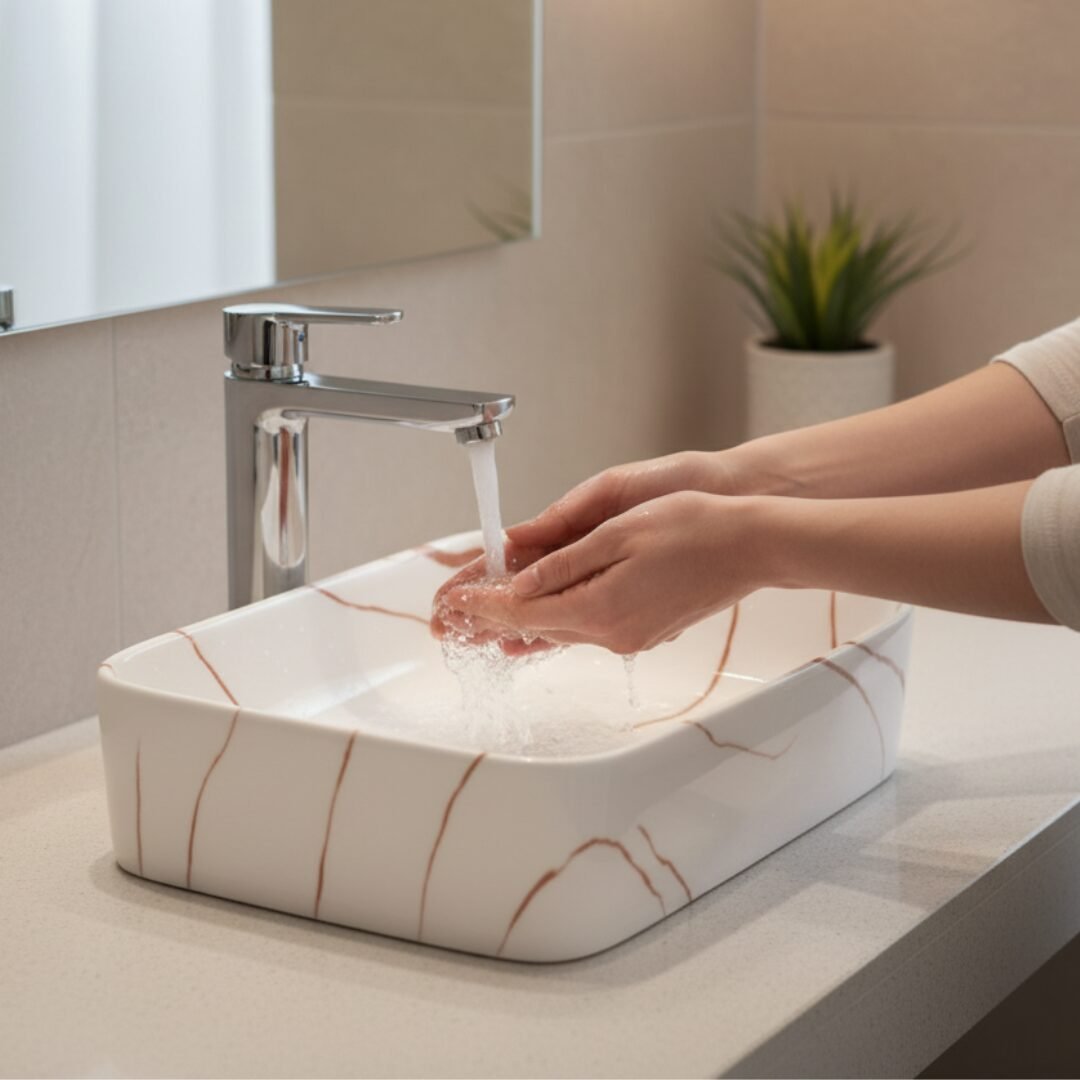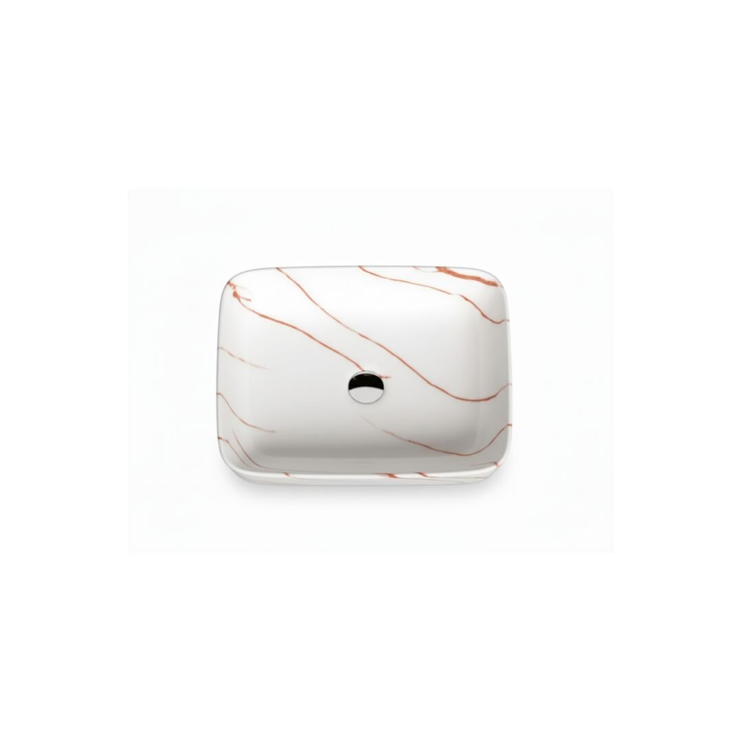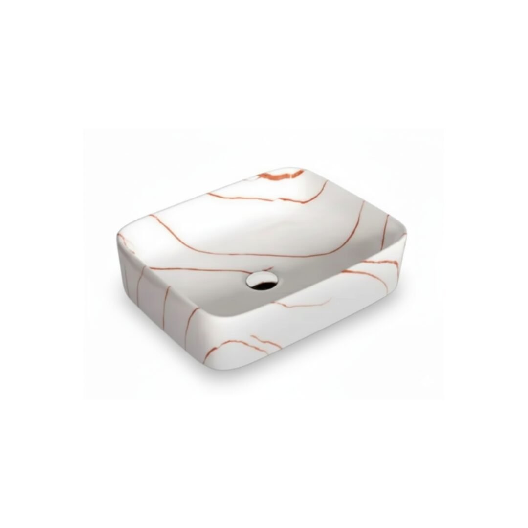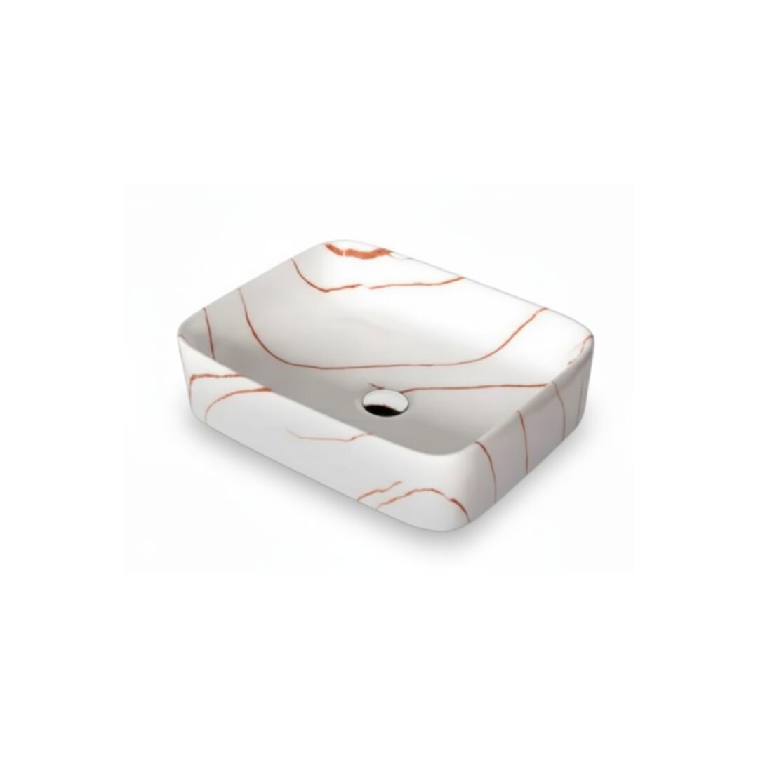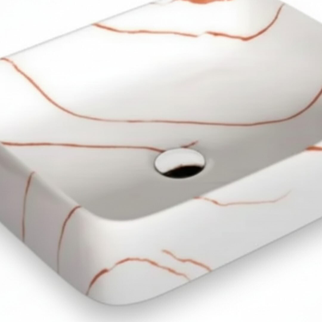 This is a stylish and modern rectangular ceramic wash basin, perfect for enhancing the aesthetic appeal of any bathroom. The basin features a pristine white base adorned with an elegant gold marble vein pattern, giving it a luxurious and contemporary look. Its glossy finish adds a touch of sophistication while making the surface easy to clean and maintain. The gently curved edges provide a sleek and smooth appearance, ensuring it blends seamlessly with various bathroom styles. The basin is designed for countertop installation, making it ideal for vanity setups in both residential and commercial spaces. It includes a central drain hole, compatible with standard drain fittings, ensuring efficient water drainage. Its compact yet practical design provides ample space for everyday use while maintaining a minimalist profile. This wash basin is an excellent choice for those seeking to combine functionality with high-end design.
