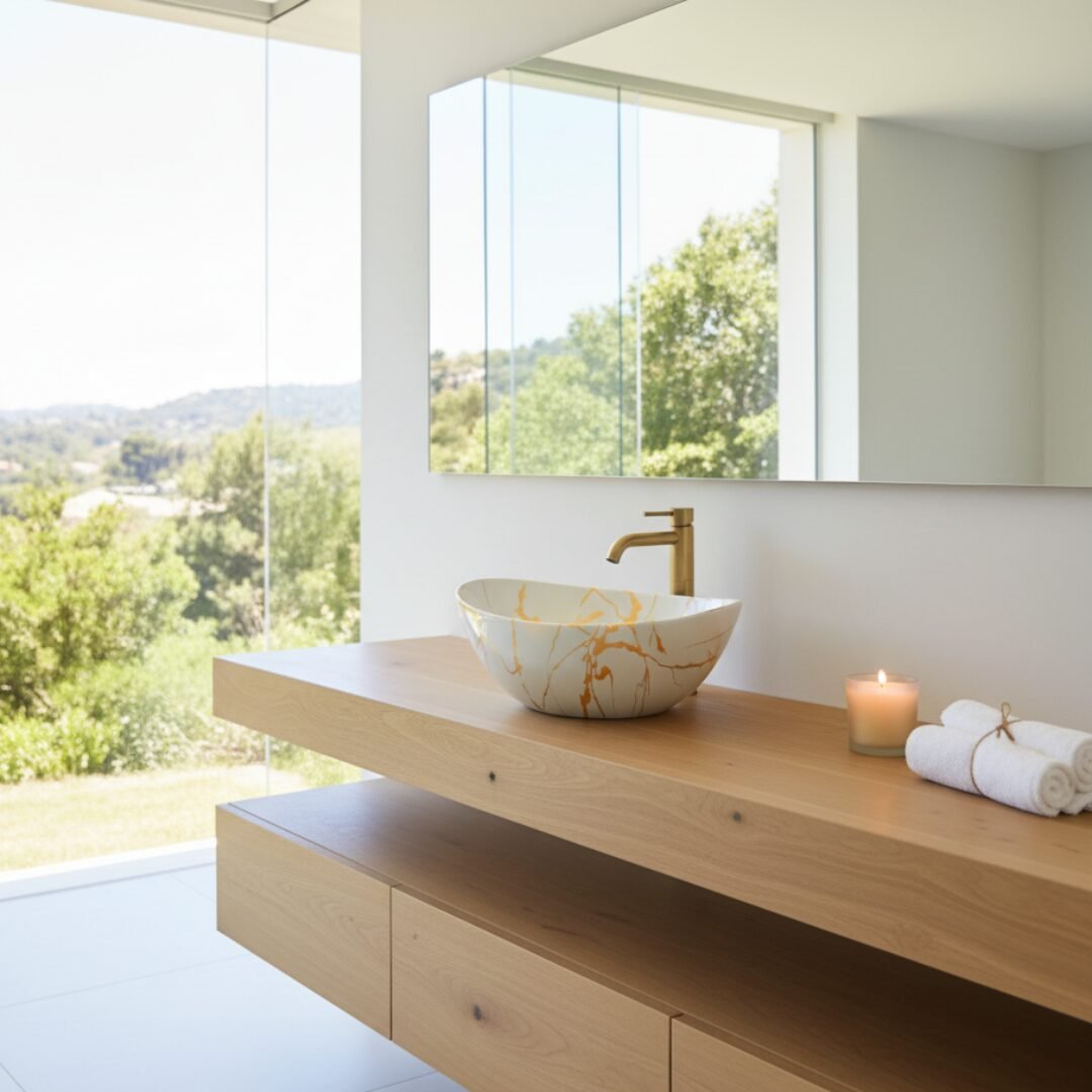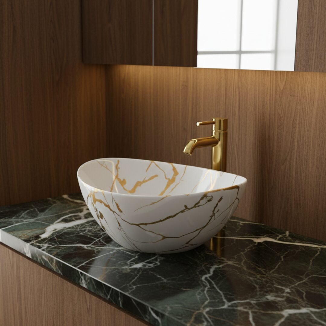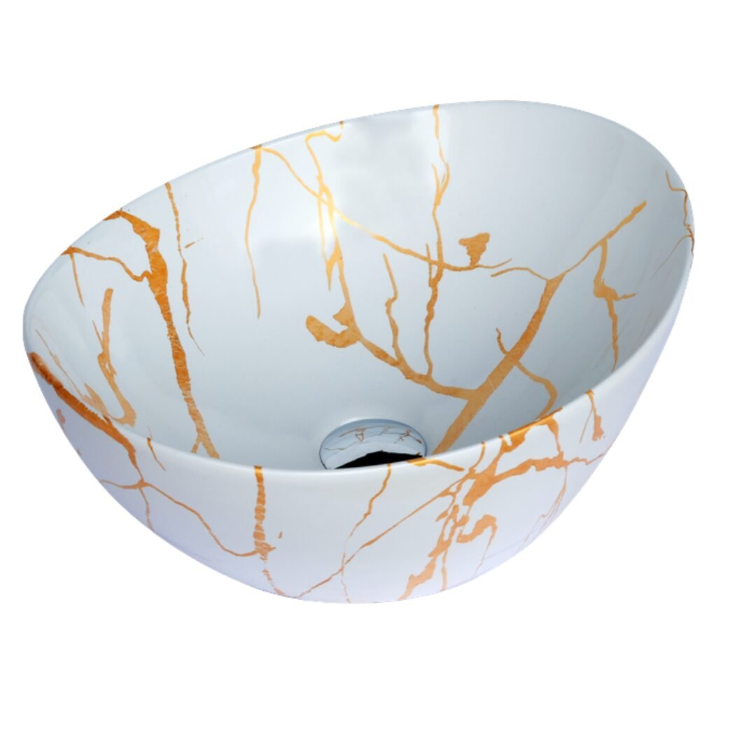 Elevate your space with this modern oval wash basin. Crafted from high-quality ceramic with a stunning amber-toned marble effect, it offers the beauty of stone with the practicality of ceramic. The unique veining creates a warm and sophisticated focal point for your bathroom.