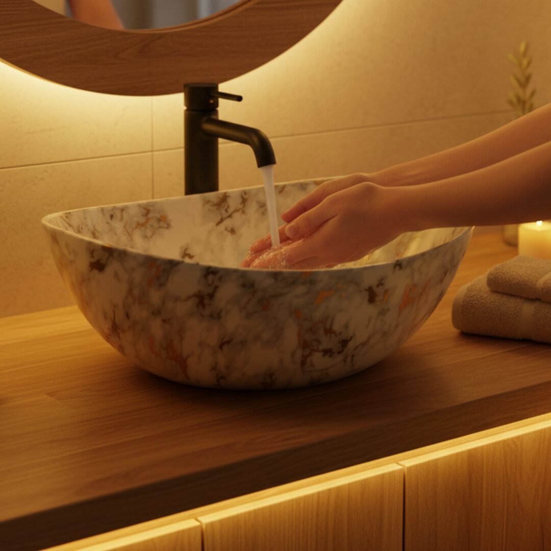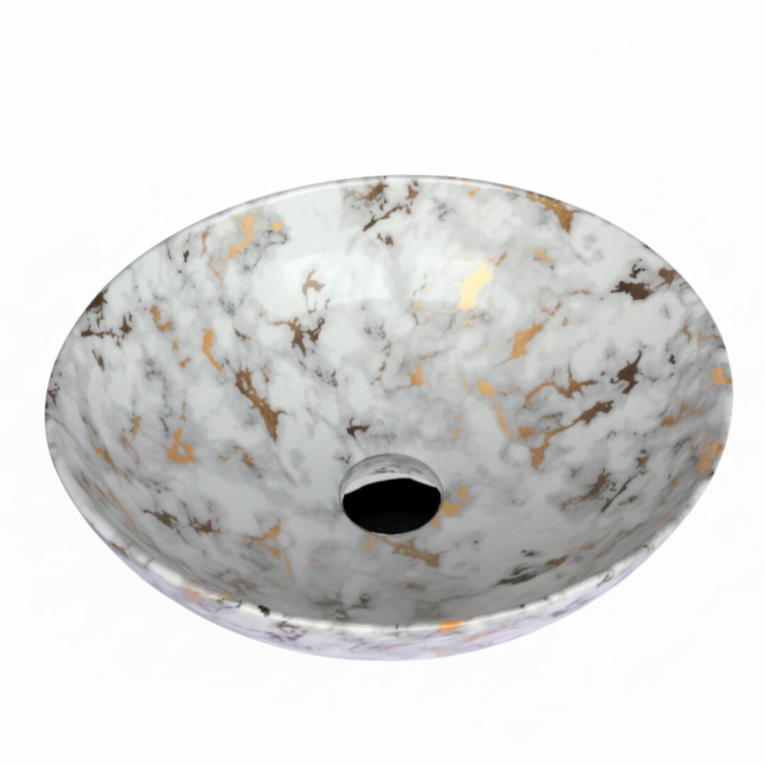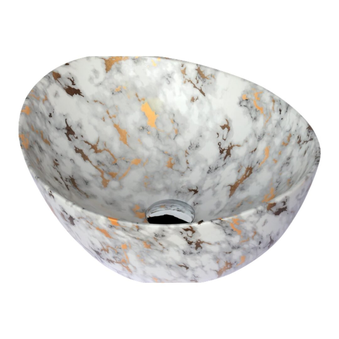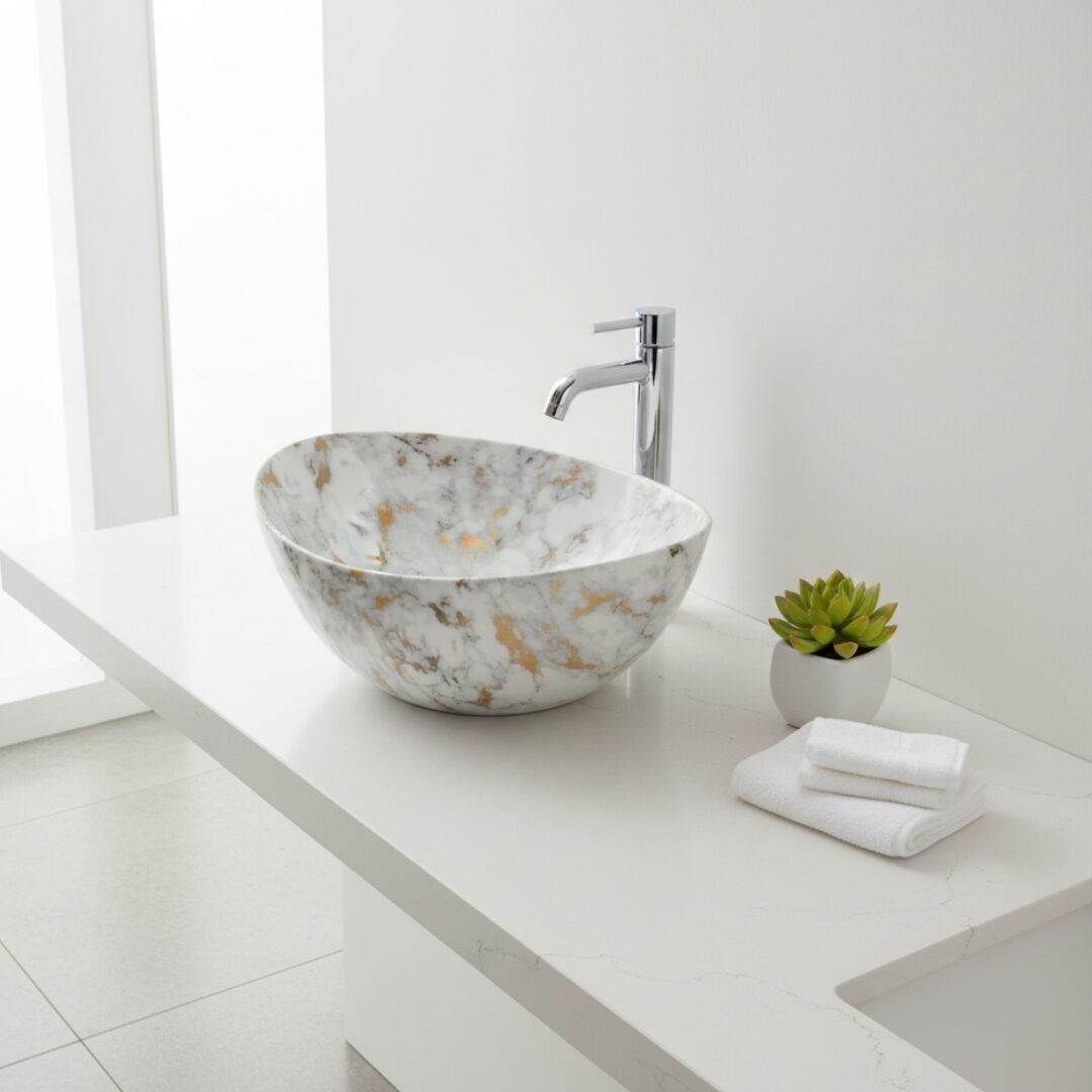 Elevate your space with this modern oval wash basin. Crafted from high-quality ceramic with a stunning amber-toned marble effect, it offers the beauty of stone with the practicality of ceramic. The unique veining creates a warm and sophisticated focal point for your bathroom.