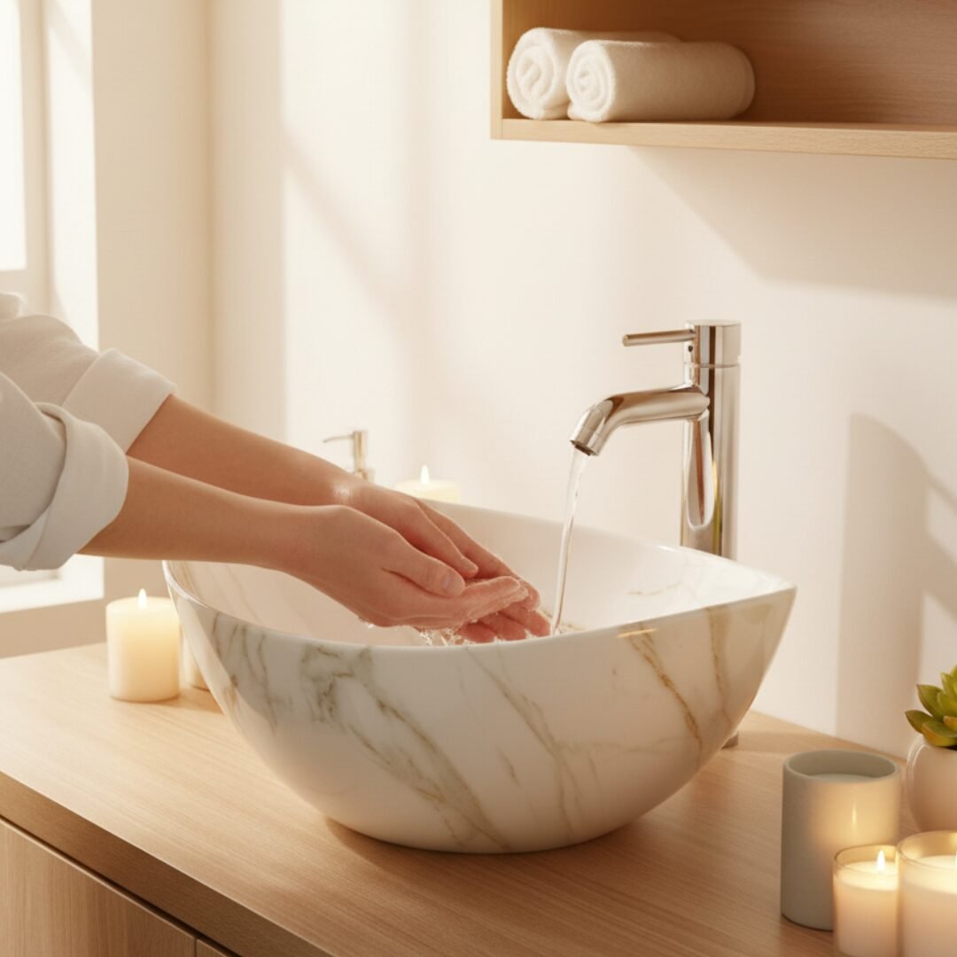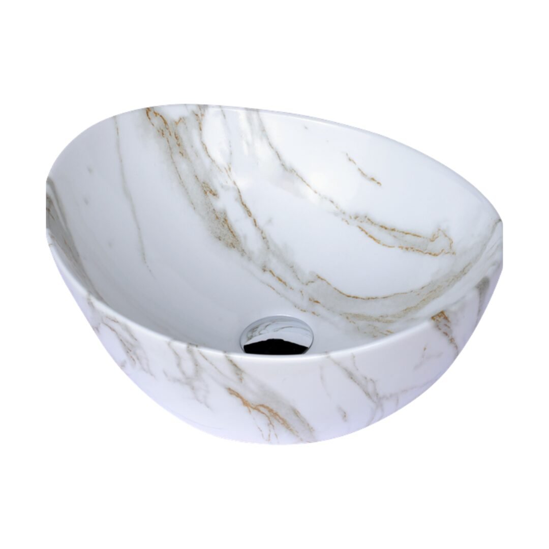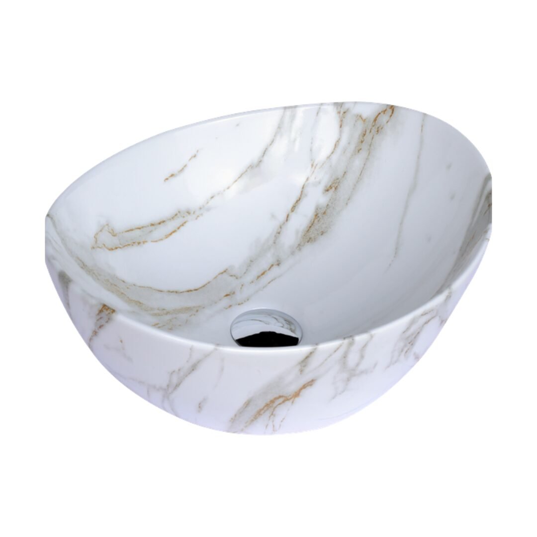 Elevate your space with this modern oval wash basin. Crafted from high-quality ceramic with a stunning amber-toned marble effect, it offers the beauty of stone with the practicality of ceramic. The unique veining creates a warm and sophisticated focal point for your bathroom.