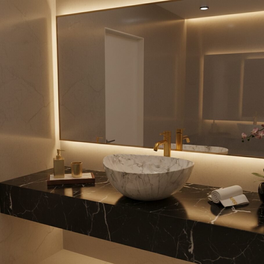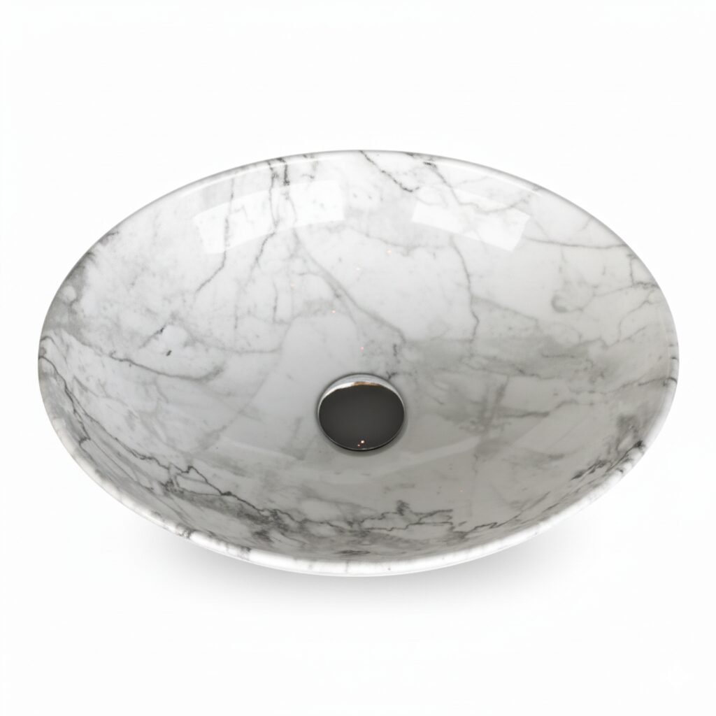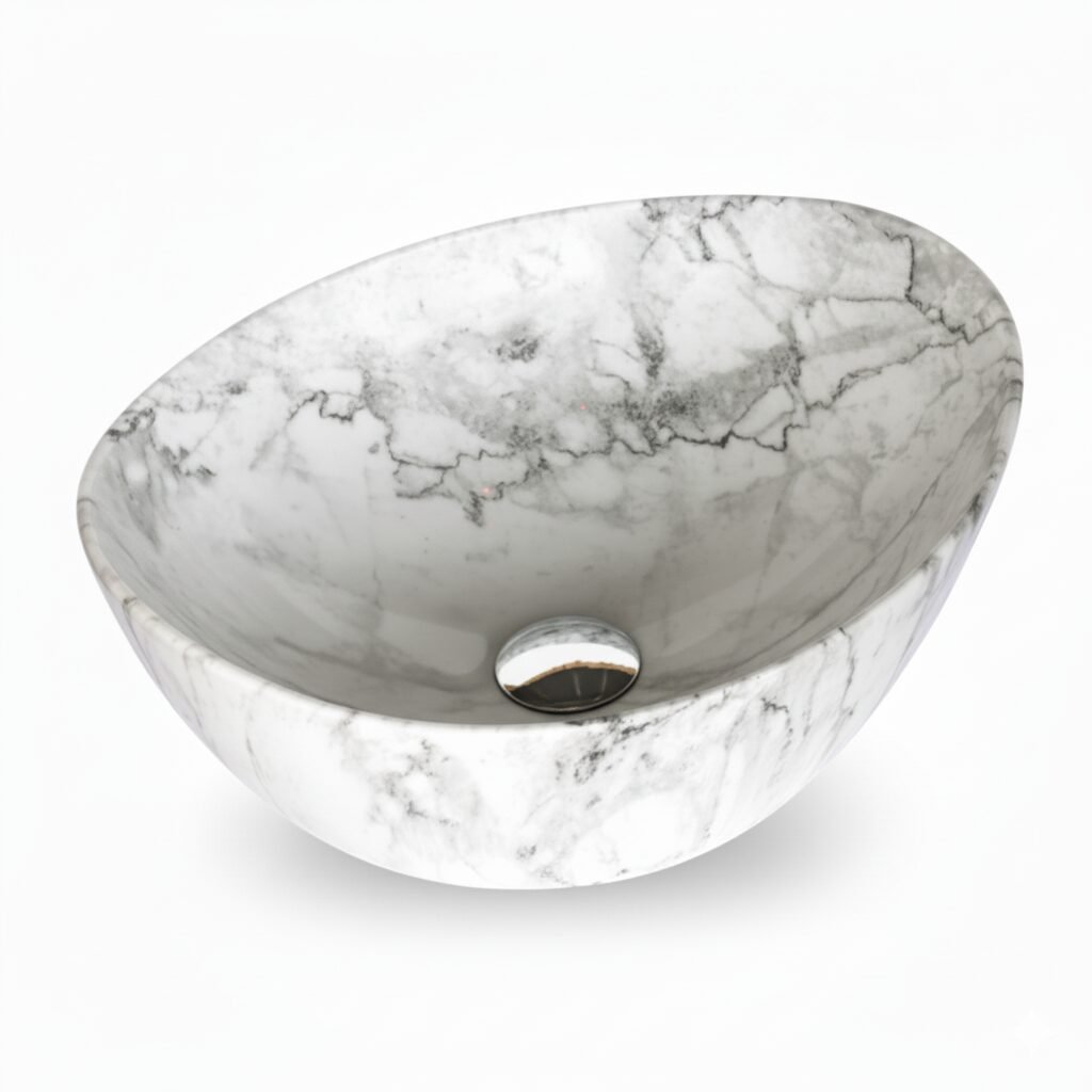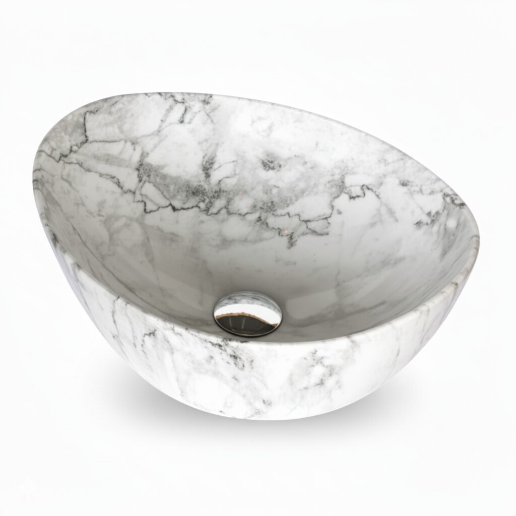 Elevate your space with this modern oval wash basin. Crafted from high-quality ceramic with a stunning amber-toned marble effect, it offers the beauty of stone with the practicality of ceramic. The unique veining creates a warm and sophisticated focal point for your bathroom.