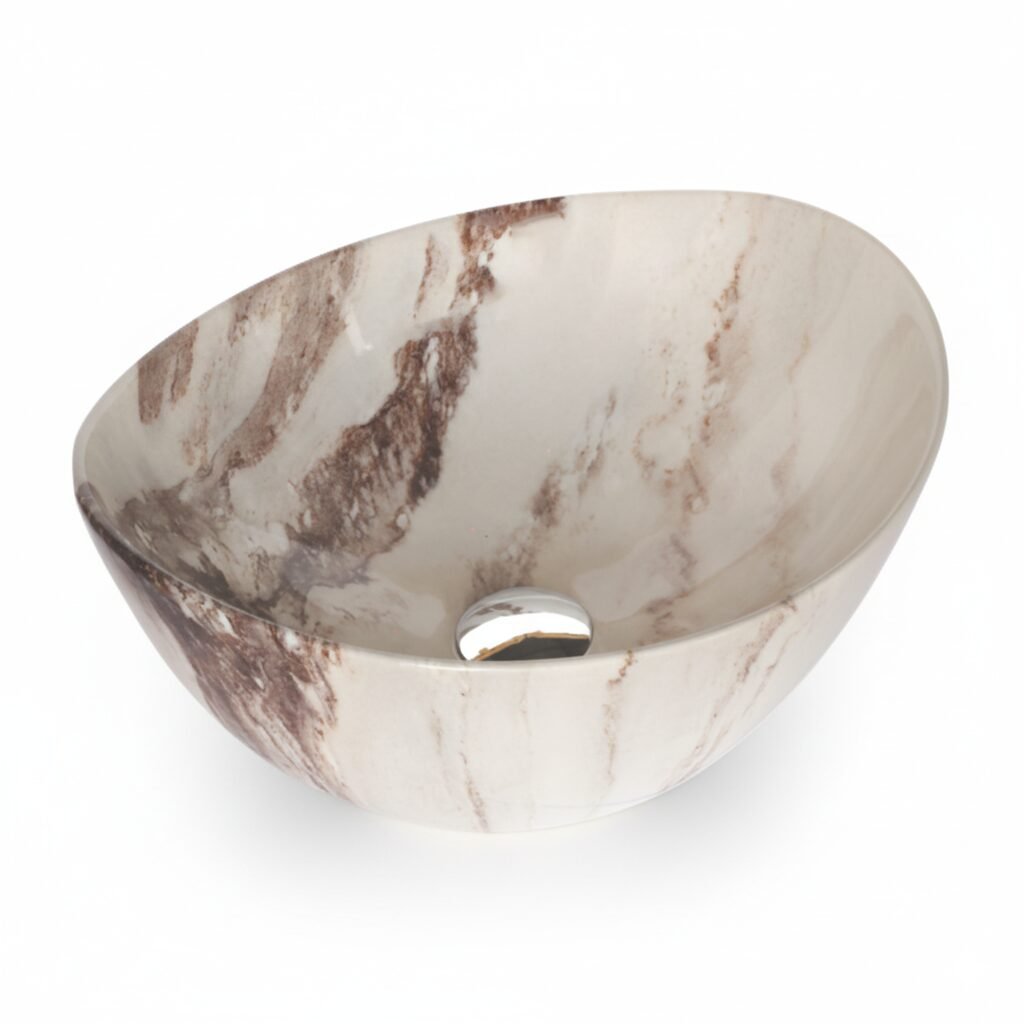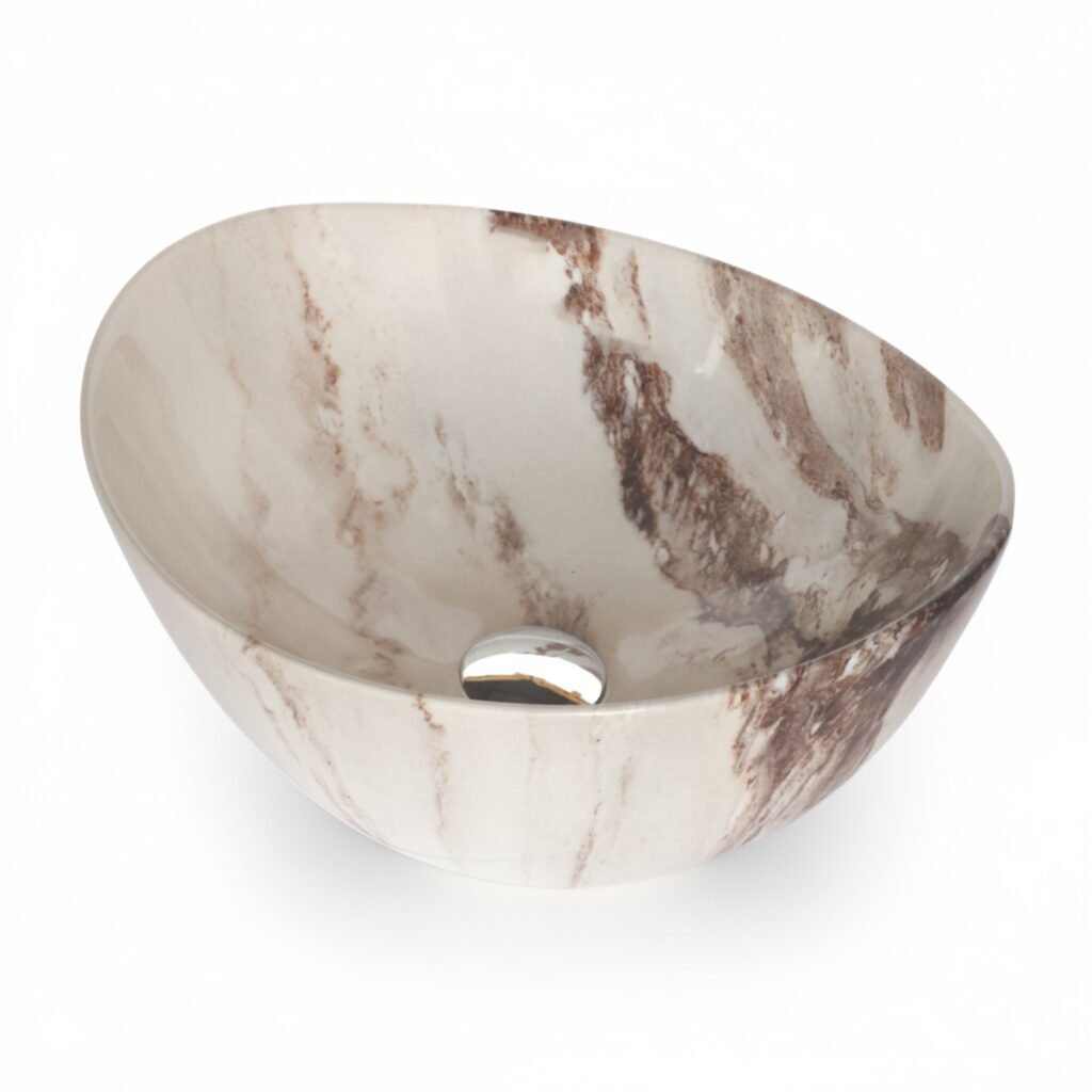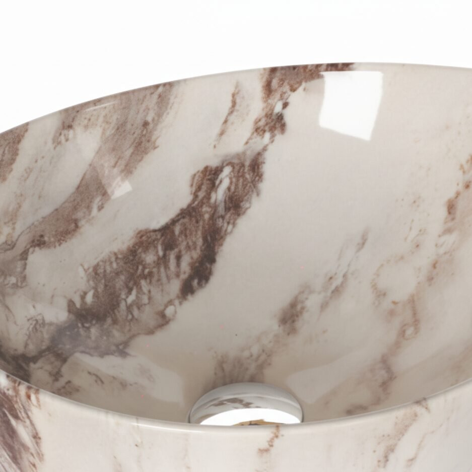 Elevate your space with this modern oval wash basin. Crafted from high-quality ceramic with a stunning amber-toned marble effect, it offers the beauty of stone with the practicality of ceramic. The unique veining creates a warm and sophisticated focal point for your bathroom.
