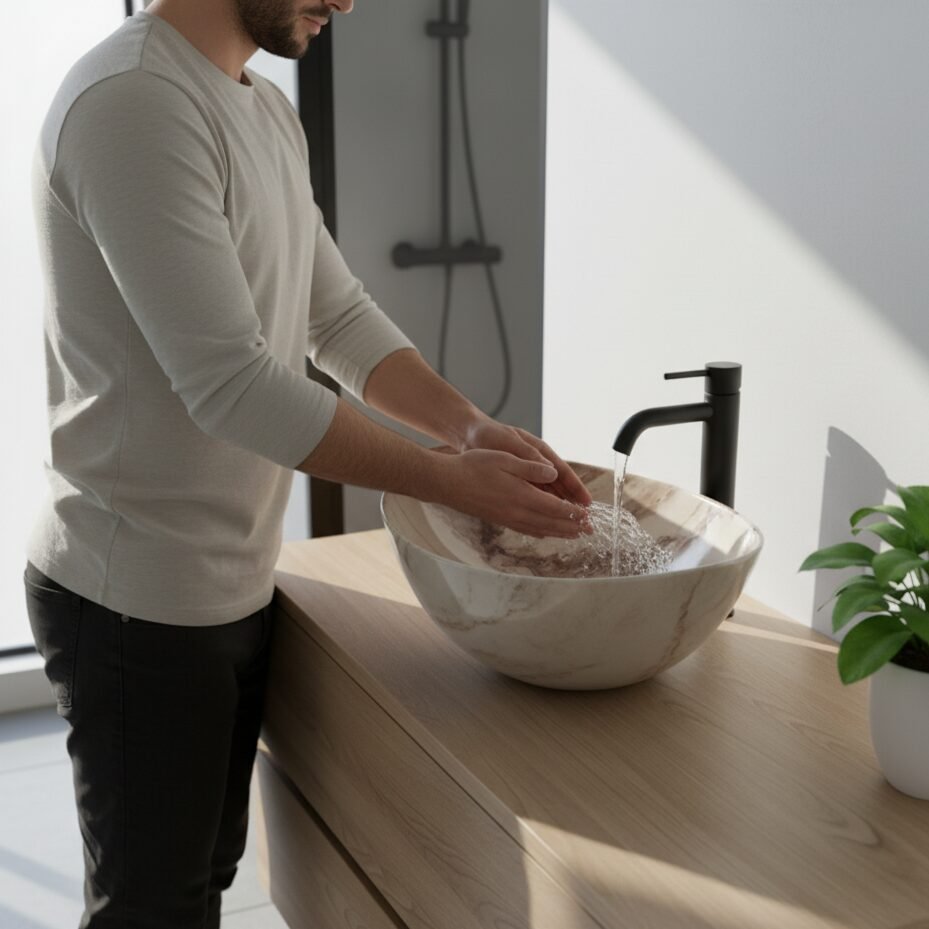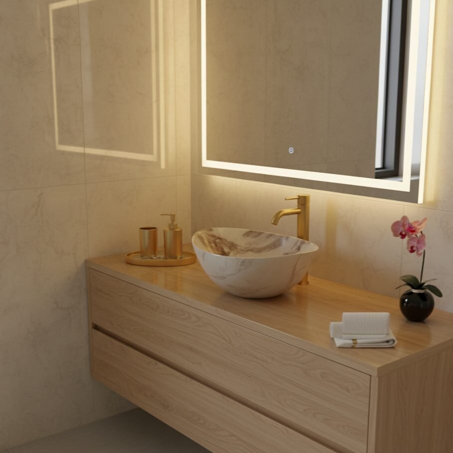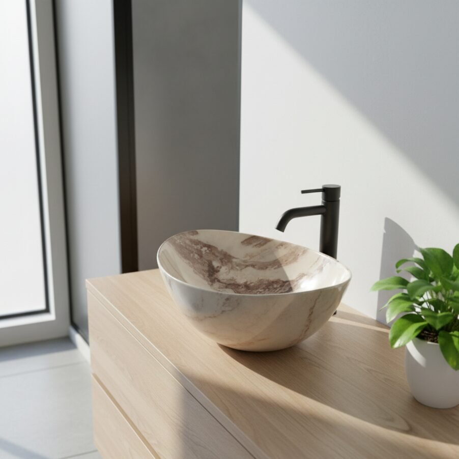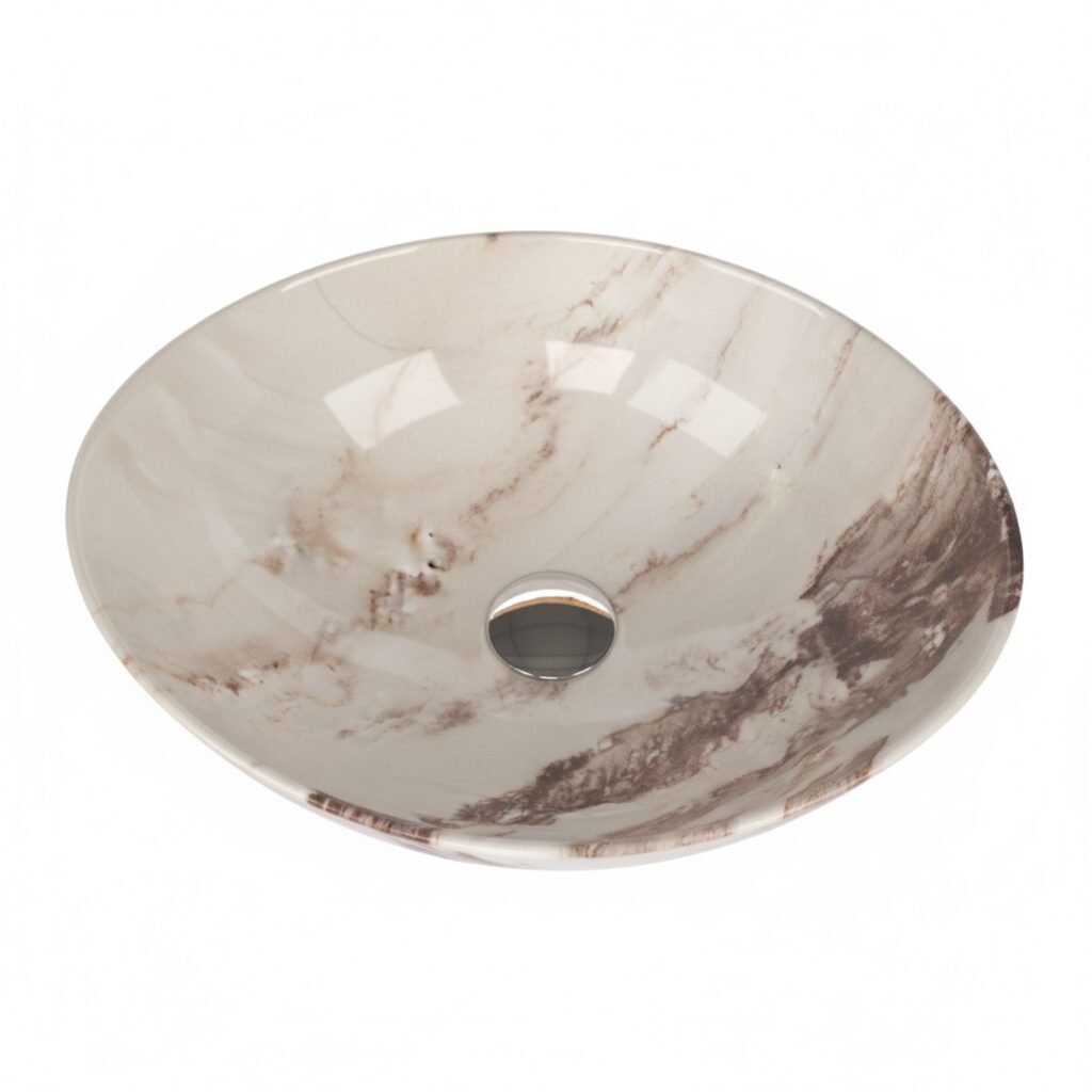 Elevate your space with this modern oval wash basin. Crafted from high-quality ceramic with a stunning amber-toned marble effect, it offers the beauty of stone with the practicality of ceramic. The unique veining creates a warm and sophisticated focal point for your bathroom.
