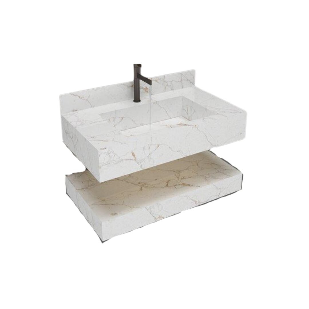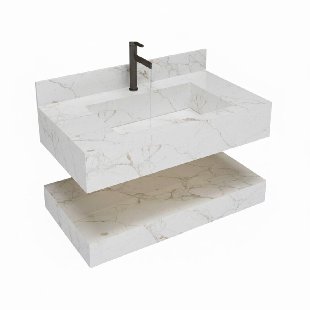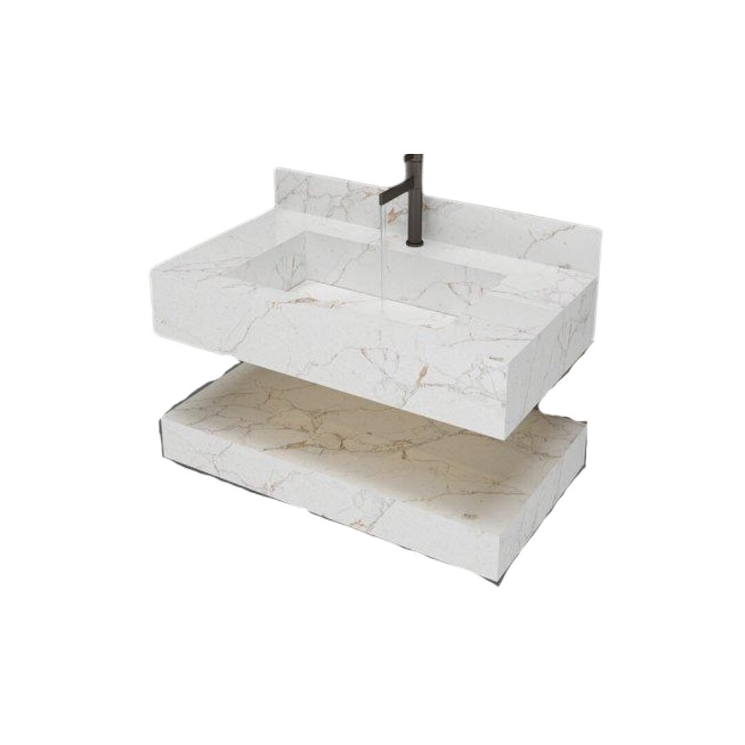 Elevate your bathroom aesthetic with this luxurious floating sink. Crafted from premium stone with rich teal and earthy brown tones, this vanity features a seamless rectangular basin and sleek, minimalist lines. The integrated backsplash and matte black faucet add a touch of modern elegance, while the matching lower shelf provides functional storage.