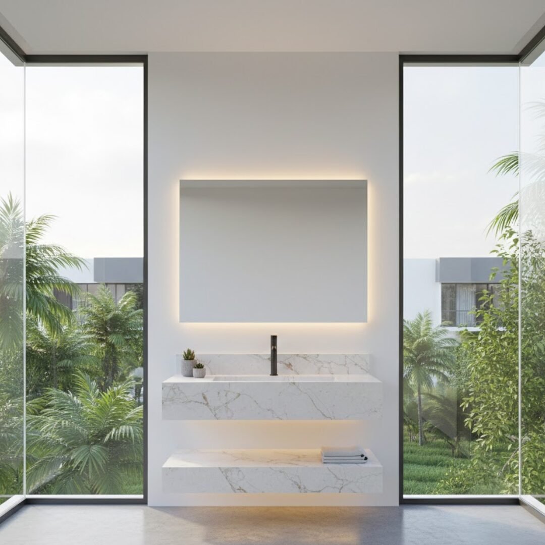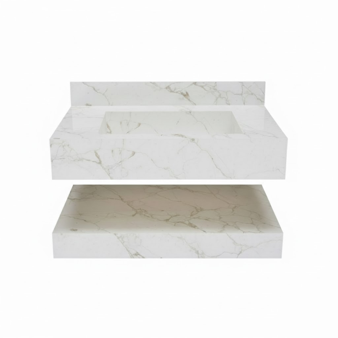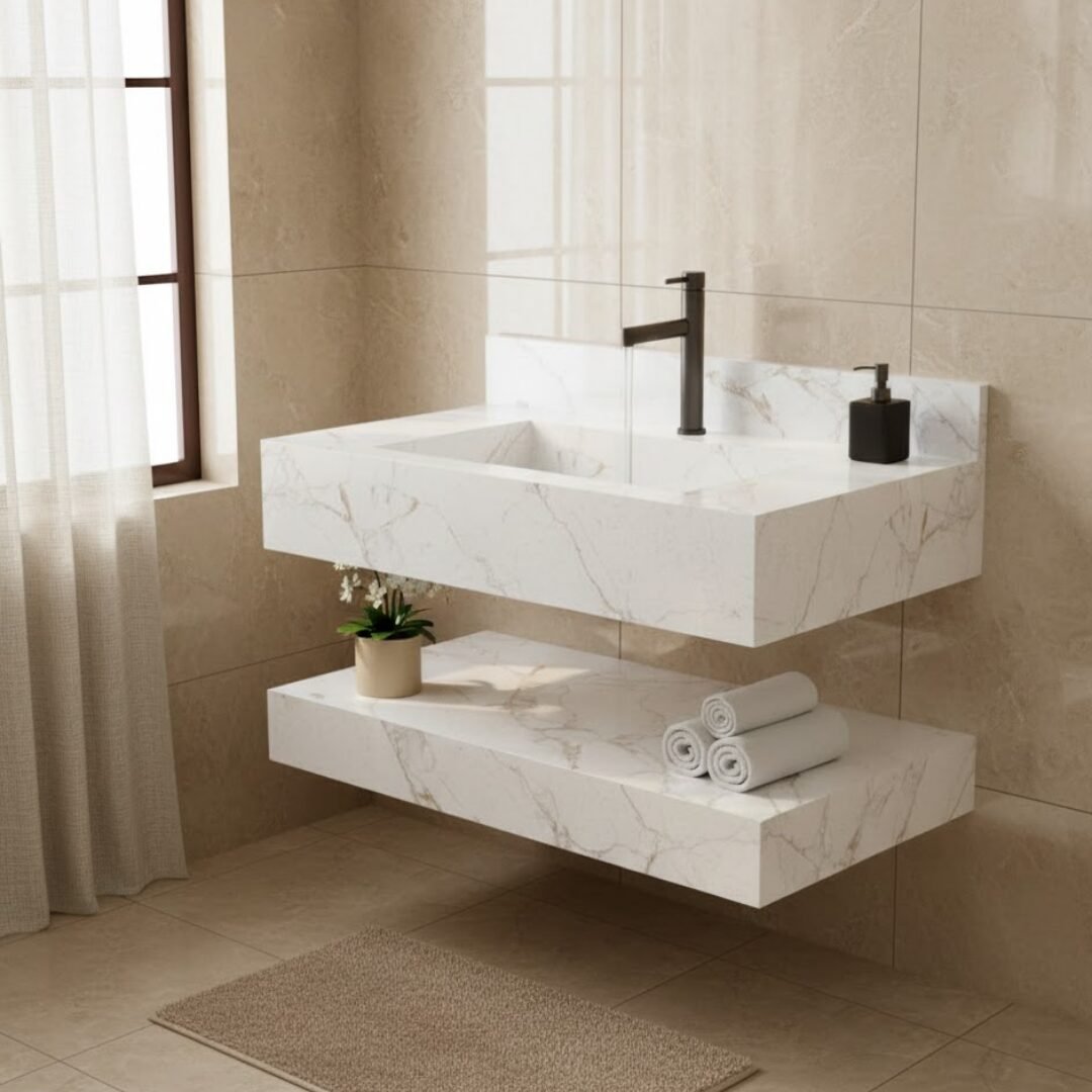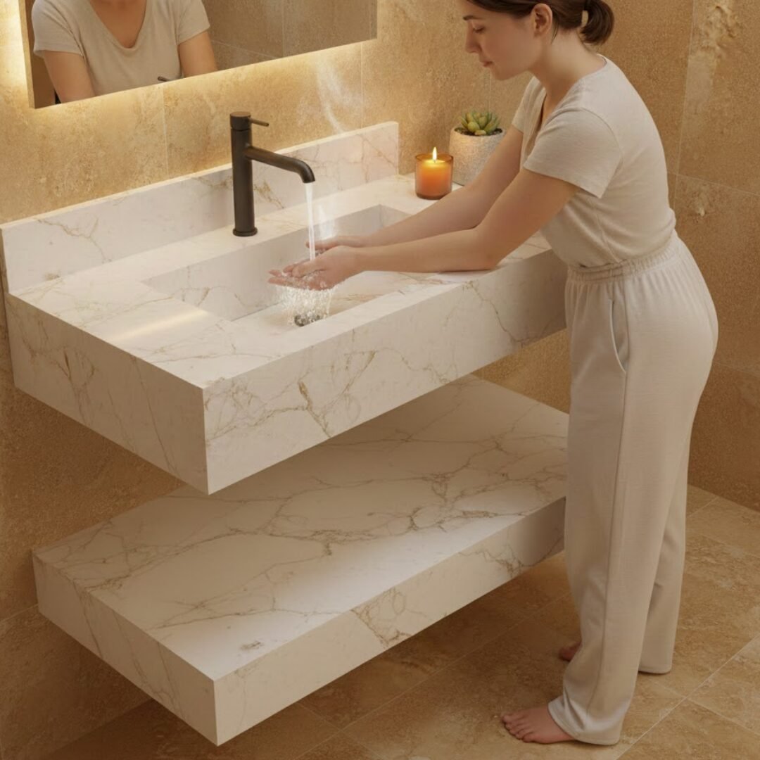 Elevate your bathroom aesthetic with this luxurious floating sink. Crafted from premium stone with rich teal and earthy brown tones, this vanity features a seamless rectangular basin and sleek, minimalist lines. The integrated backsplash and matte black faucet add a touch of modern elegance, while the matching lower shelf provides functional storage.