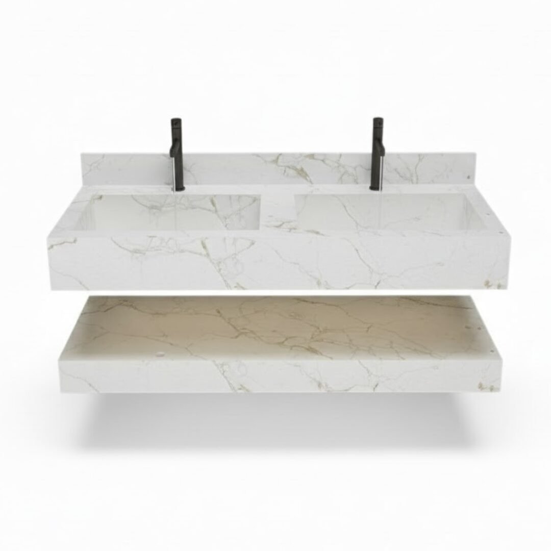 Elevate your bathroom aesthetic with this luxurious floating sink. Crafted from premium stone with rich teal and earthy brown tones, this vanity features a seamless rectangular basin and sleek, minimalist lines. The integrated backsplash and matte black faucet add a touch of modern elegance, while the matching lower shelf provides functional storage.