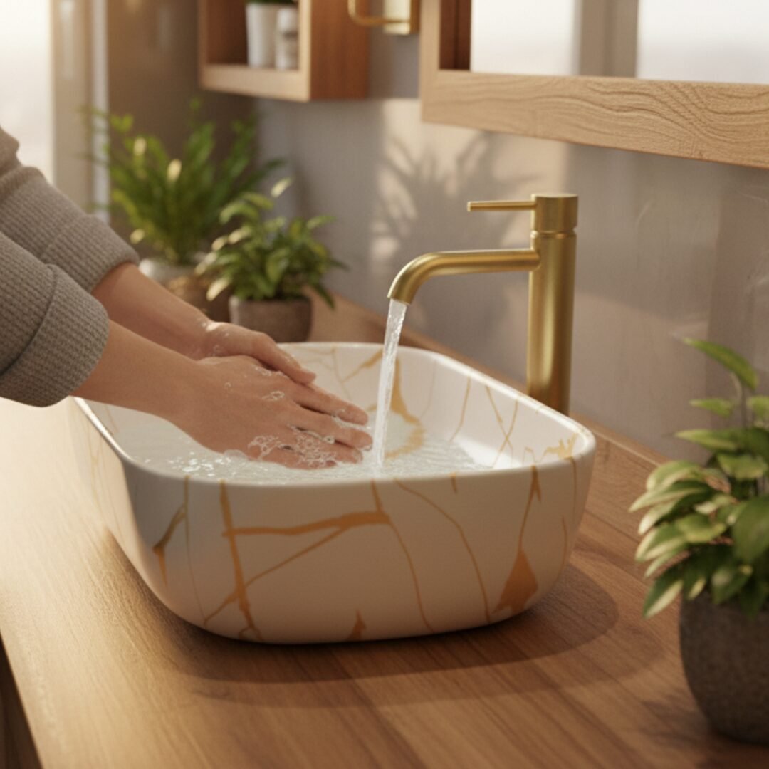 This is a stylish and modern rectangular ceramic wash basin, perfect for enhancing the aesthetic appeal of any bathroom. The basin features a pristine white base adorned with an elegant gold marble vein pattern, giving it a luxurious and contemporary look. Its glossy finish adds a touch of sophistication while making the surface easy to clean and maintain. The gently curved edges provide a sleek and smooth appearance, ensuring it blends seamlessly with various bathroom styles. The basin is designed for countertop installation, making it ideal for vanity setups in both residential and commercial spaces. It includes a central drain hole, compatible with standard drain fittings, ensuring efficient water drainage. Its compact yet practical design provides ample space for everyday use while maintaining a minimalist profile. This wash basin is an excellent choice for those seeking to combine functionality with high-end design.