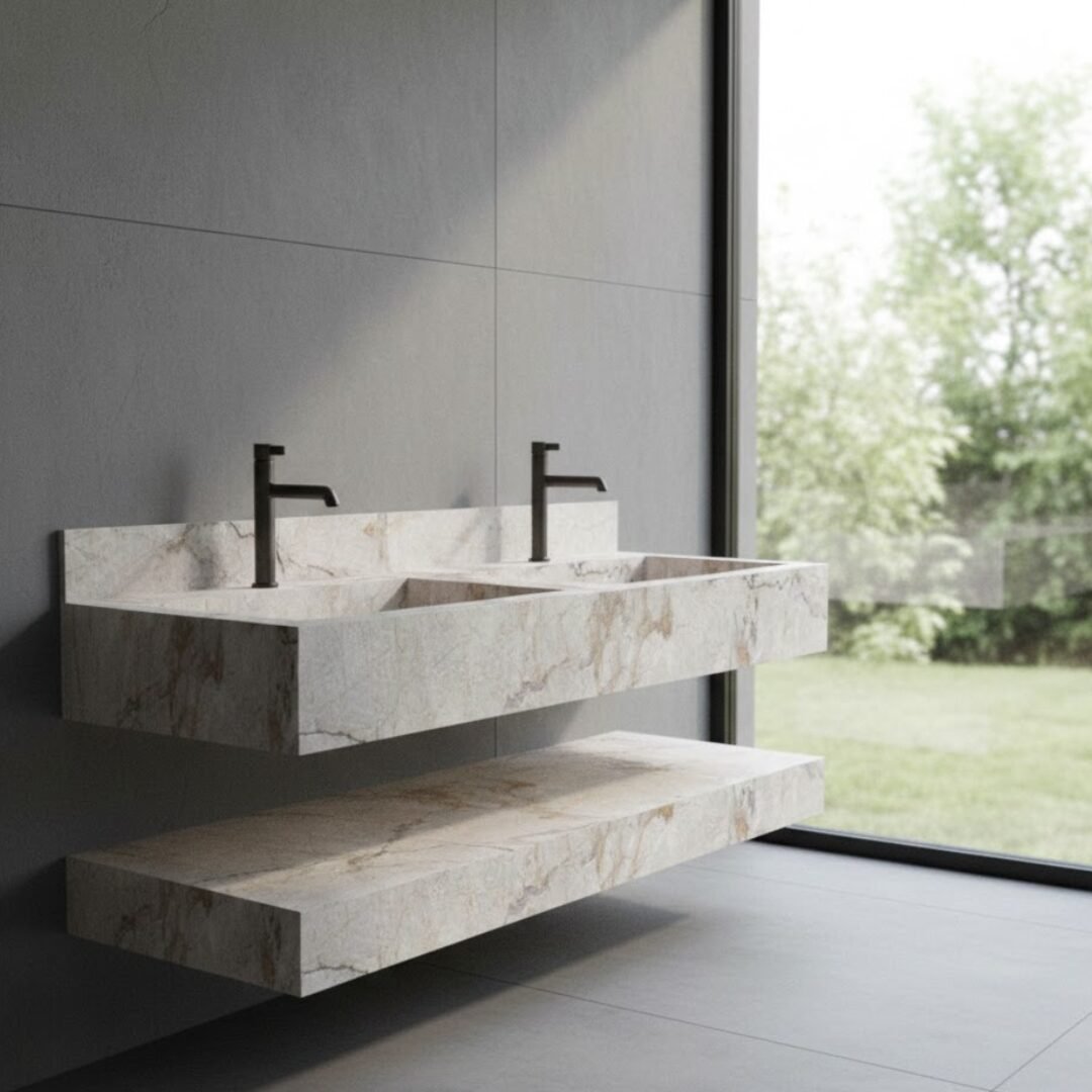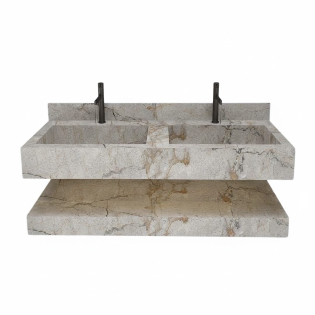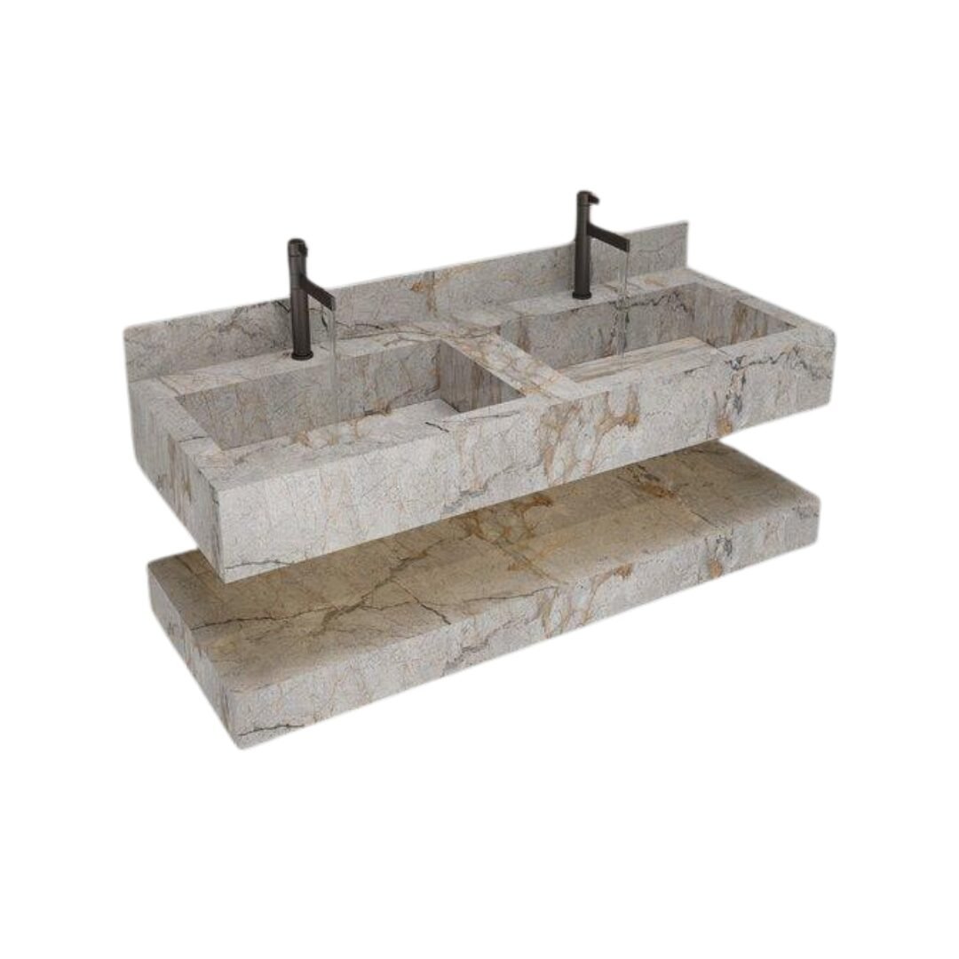 Elevate your bathroom aesthetic with this luxurious floating sink. Crafted from premium stone with rich teal and earthy brown tones, this vanity features a seamless rectangular basin and sleek, minimalist lines. The integrated backsplash and matte black faucet add a touch of modern elegance, while the matching lower shelf provides functional storage.