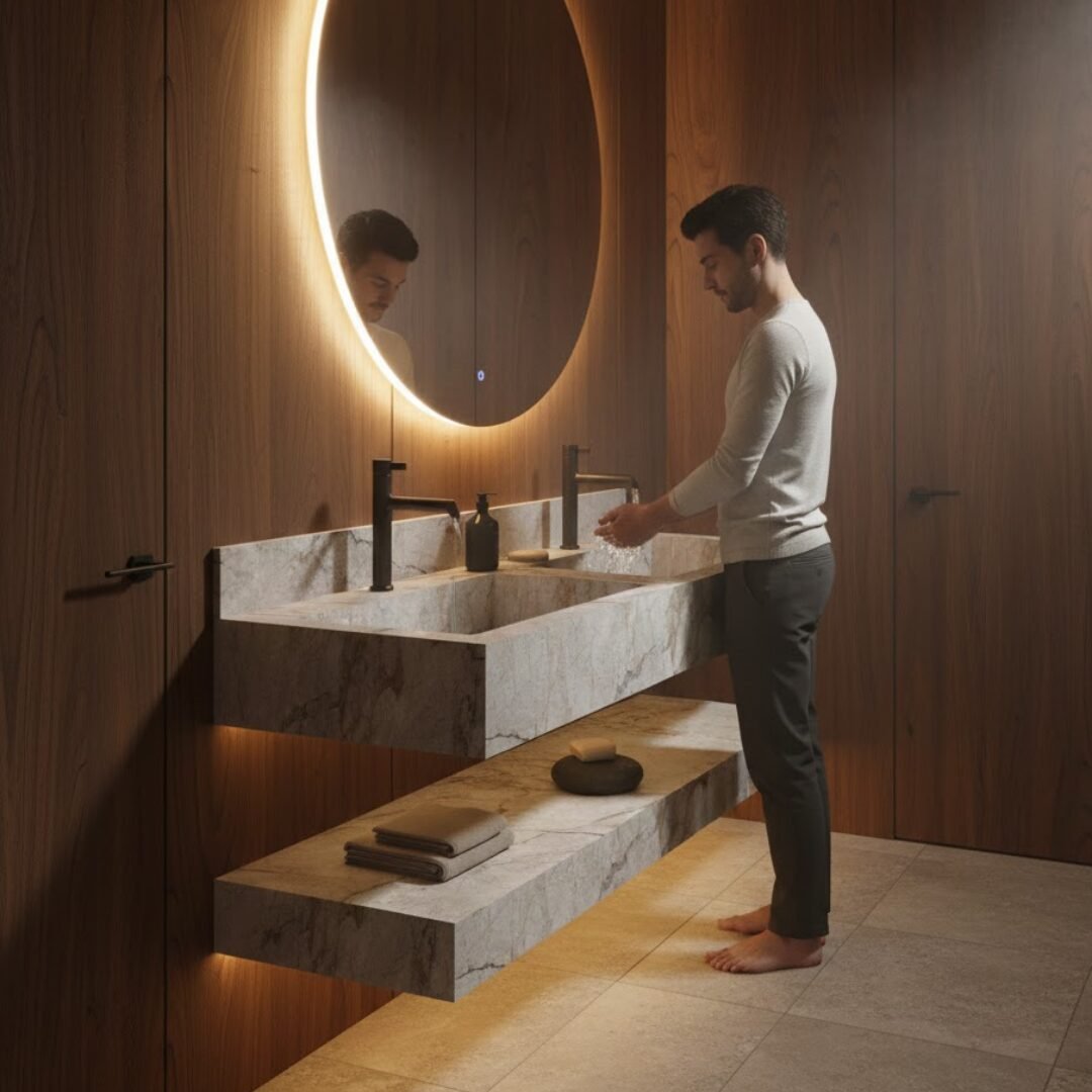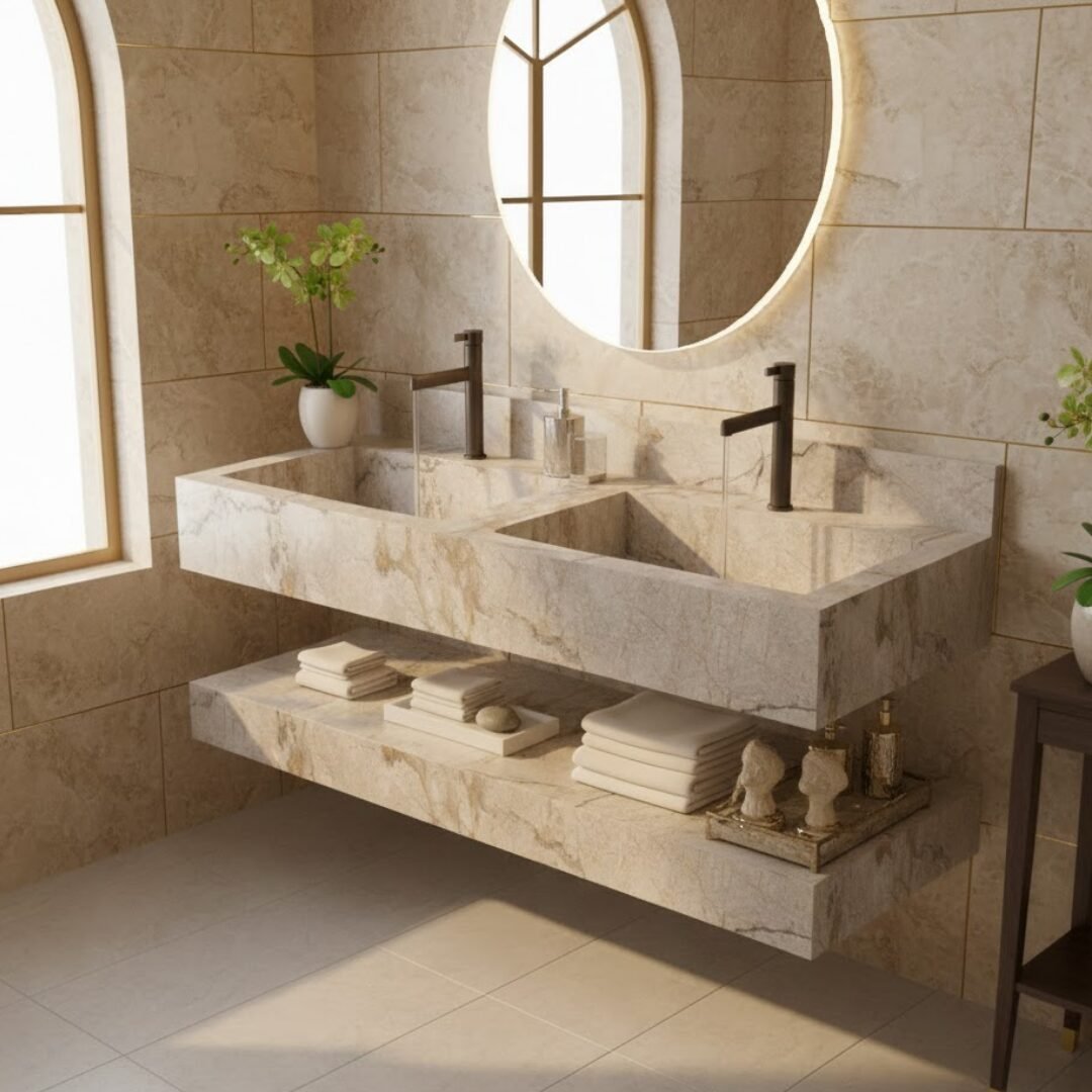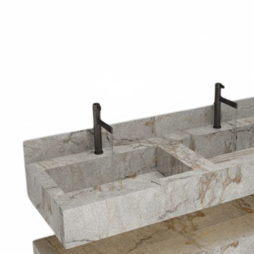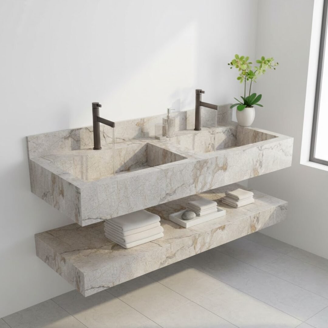 Elevate your bathroom aesthetic with this luxurious floating sink. Crafted from premium stone with rich teal and earthy brown tones, this vanity features a seamless rectangular basin and sleek, minimalist lines. The integrated backsplash and matte black faucet add a touch of modern elegance, while the matching lower shelf provides functional storage.