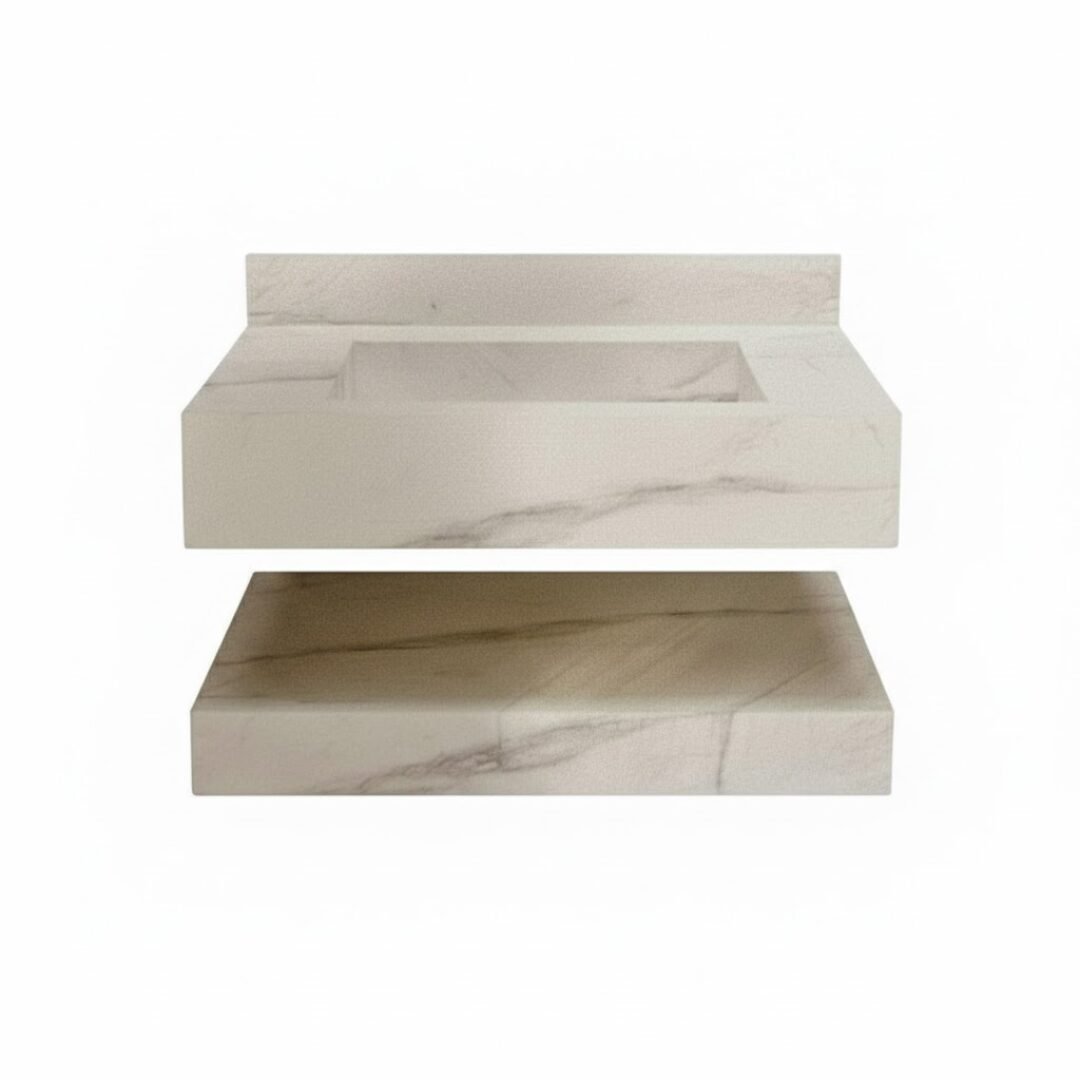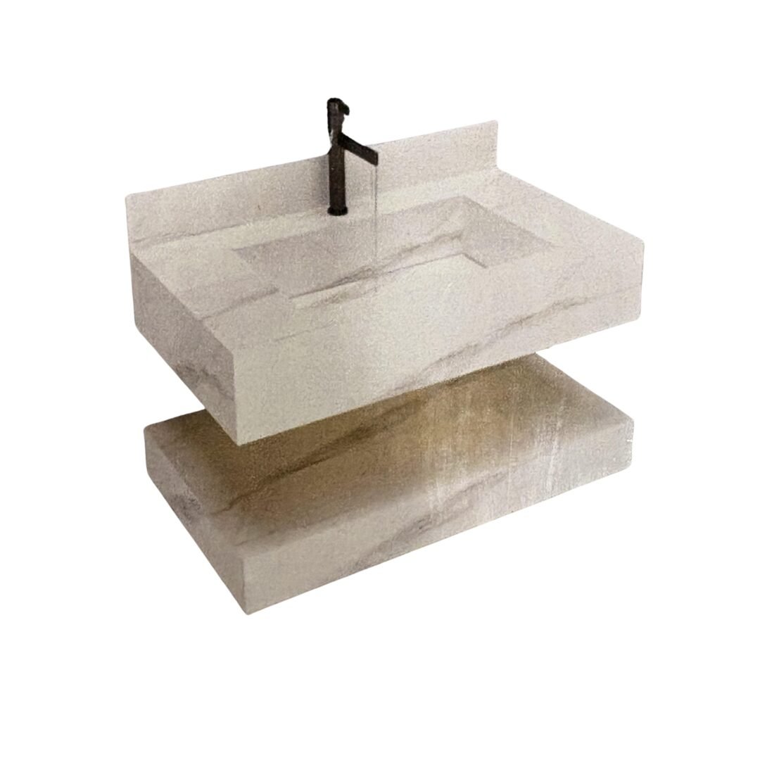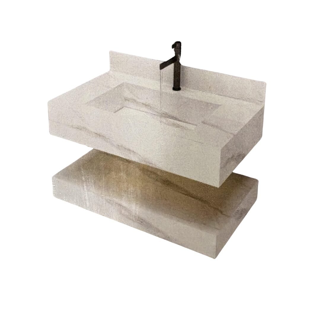Elevate your bathroom aesthetic with this luxurious floating sink. Crafted from premium stone with rich teal and earthy brown tones, this vanity features a seamless rectangular basin and sleek, minimalist lines. The integrated backsplash and matte black faucet add a touch of modern elegance, while the matching lower shelf provides functional storage.