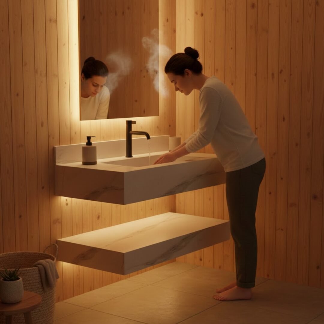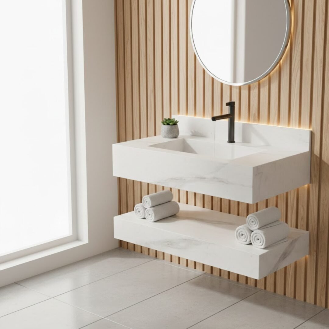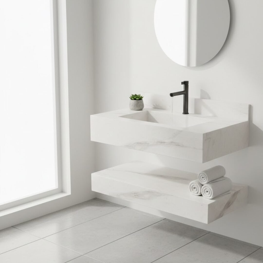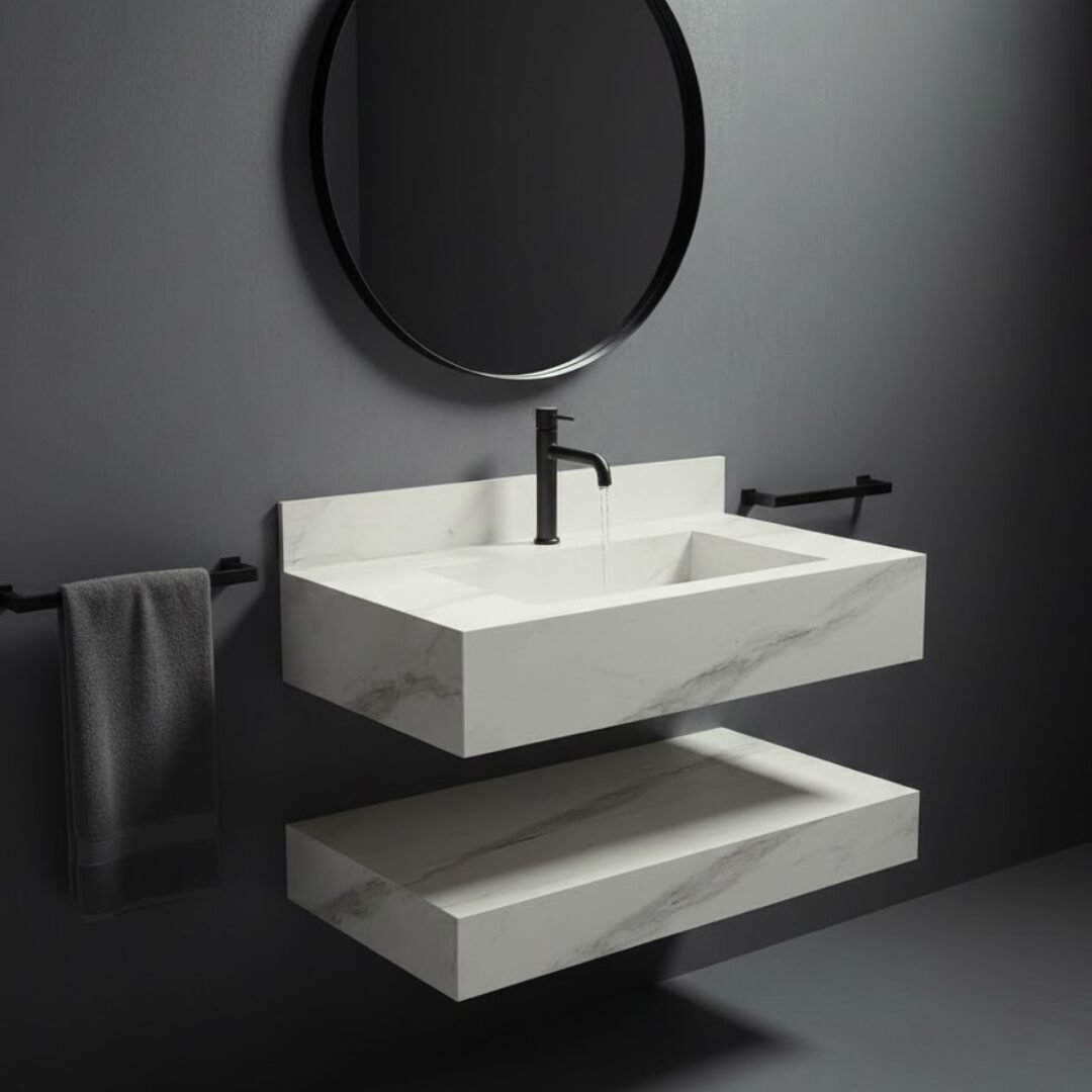Elevate your bathroom aesthetic with this luxurious floating sink. Crafted from premium stone with rich teal and earthy brown tones, this vanity features a seamless rectangular basin and sleek, minimalist lines. The integrated backsplash and matte black faucet add a touch of modern elegance, while the matching lower shelf provides functional storage.